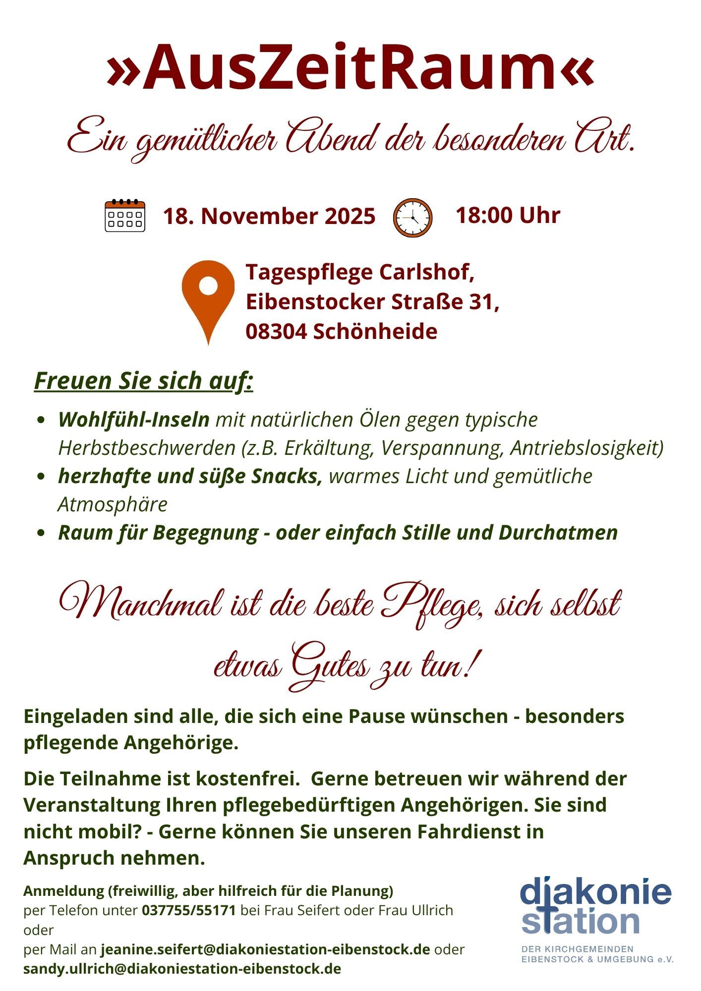 Unter diesem Motto laden wir am 18. November 2025 um 18:00 Uhr in die Räume unserer Tagespflege »Carlshof«, Eibenstocker Straße 31 in Schönheide zu unserem »AusZeitRaum« ein.